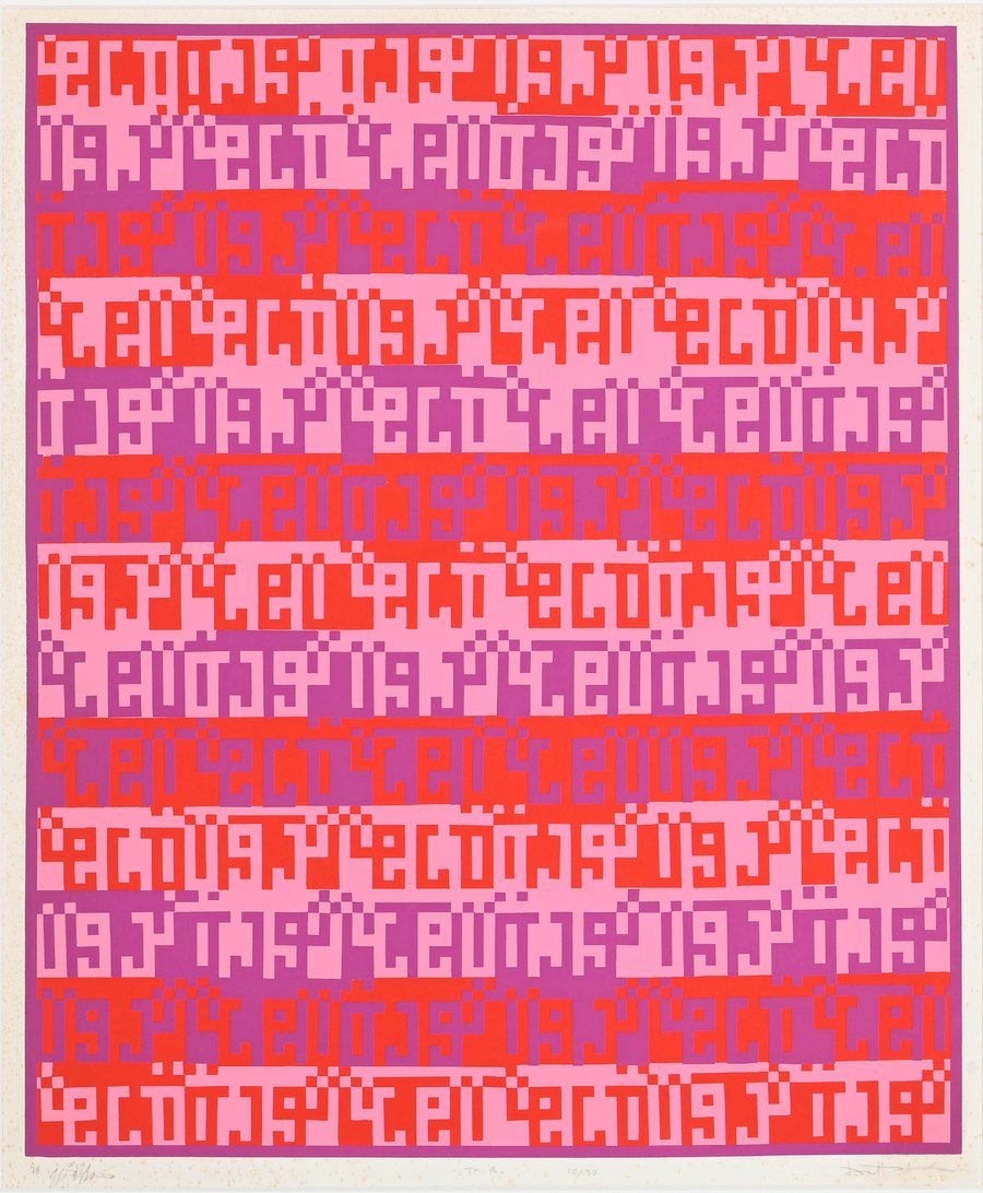 Kamal Boullata was a Palestinian artist, writer and art historian who published significant writings on the evolution of Palestinian art. Thawra/Tharwa demonstrates the artist’s distinctive Kufic style of incorporating Arabic script in his colourful calligraphic compositions. Themes relating to exile, Palestinian identity and traditional embroidery influenced Boullata’s artistic practice. His upbringing in the city of Jerusalem, particularly the decorative elements of its iconic landmark, the Dome of the Rock, is another layer of inspiration.